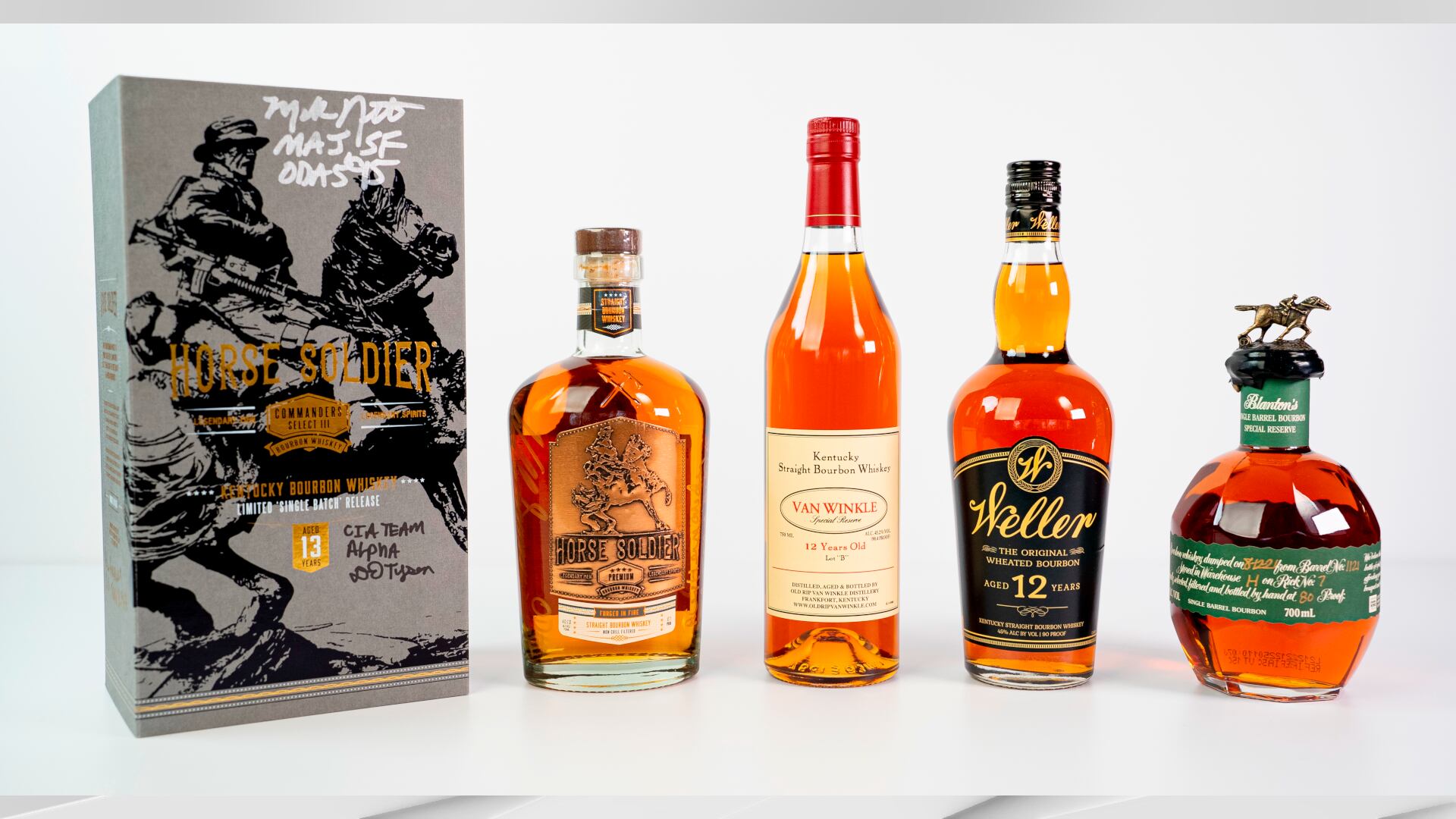 One winner will go home with five bottles of bourbon: Van Winkle Special Reserve 12 Years Old Lot B, Horse Soldier Commander’s Select 13 Year Bourbon Whiskey in a signed box, a signed bottle of Horse Soldier Straight Bourbon, W.L. Weller 12 Year, and Blanton’s Green Label Special Reserve.